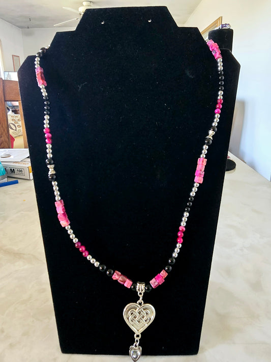 Beaded Memory Wire Bracelet and Necklace Set with Black Onyx and Pink Striped Beads Silver Charm Gift For Her