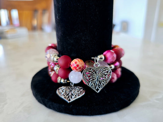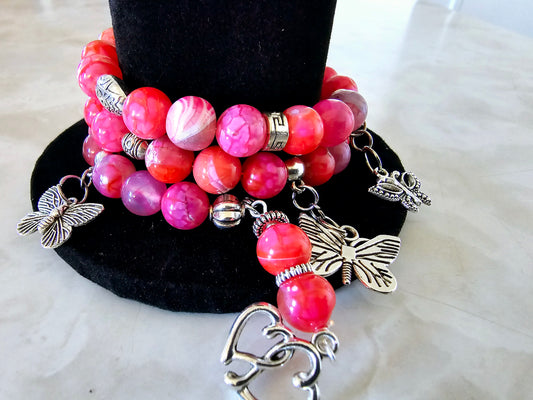 Beaded Memory Wire Bracelet Pink Glass Beads with Silver Hearts and Butterfly Charms Fashion Statement Gift For Her