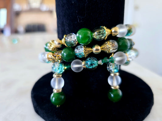 Beaded Memory Wire Bracelet + Earring Set Hunter Green Clear Green and Gold Crackle Beads Gold Spacers One-Of-A-Kind Jewelry For Her